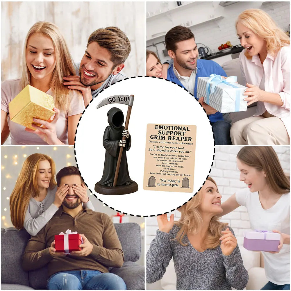 - Gothic resin sculpture blends a stoic reaper with a playful feline companion, delivering dark humor and cozy memento mori vibes to your workspace.